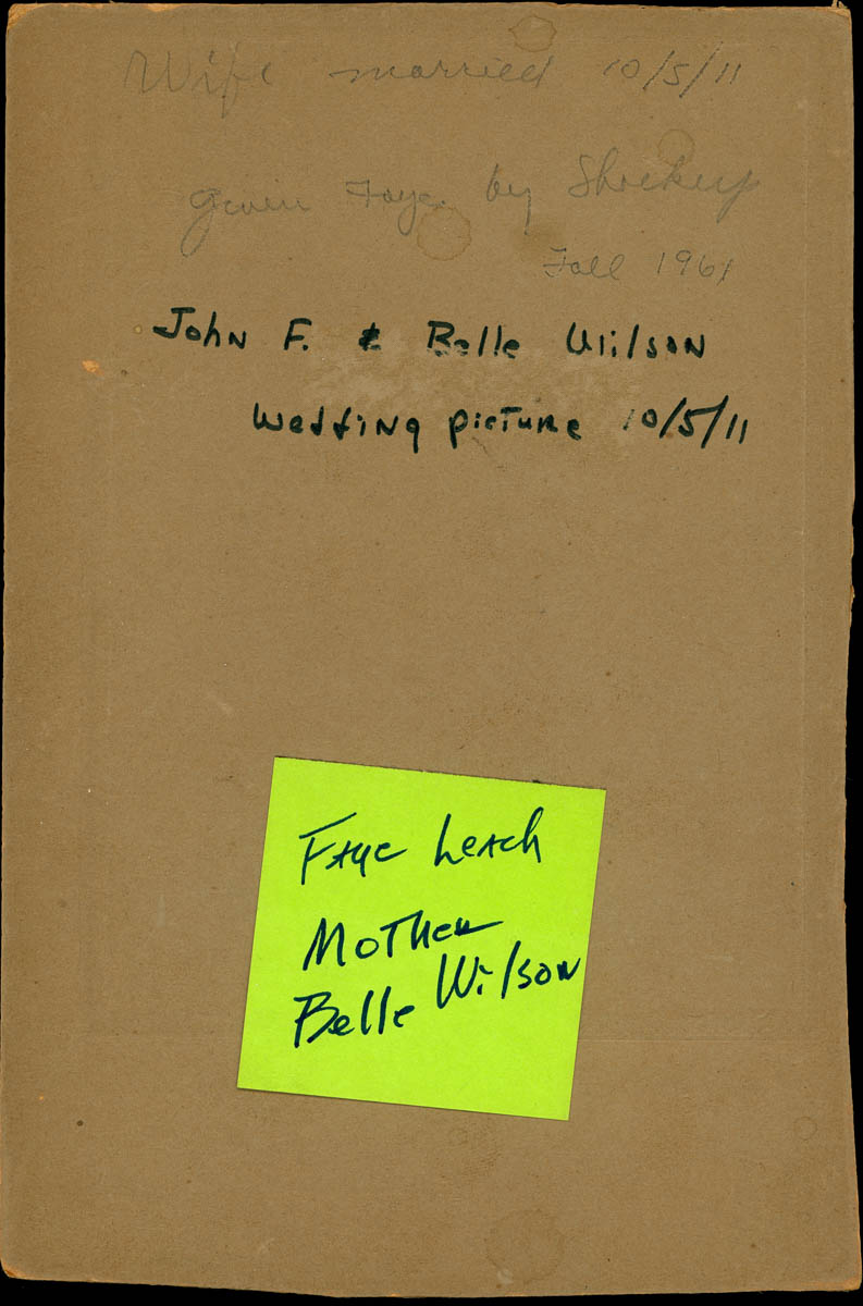 - Portrait of a couple. Handwritten notes on back say "Wife married 10/5/11 given Faye by Shockey Fall 1961" and "John F. & Belle Wilson wedding picture 10/5/11" This is an item in a scrapbook.