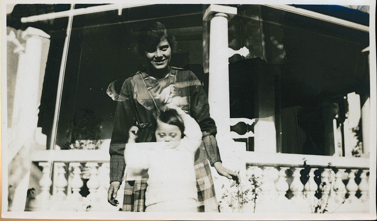 - Picture of a girl and a baby standing in front of a house