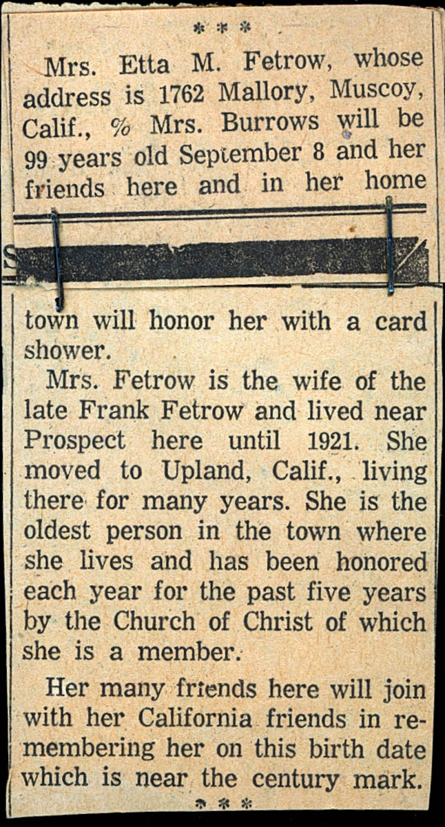 - Newspaper Article About Etta Fetrow's 99th Birthday