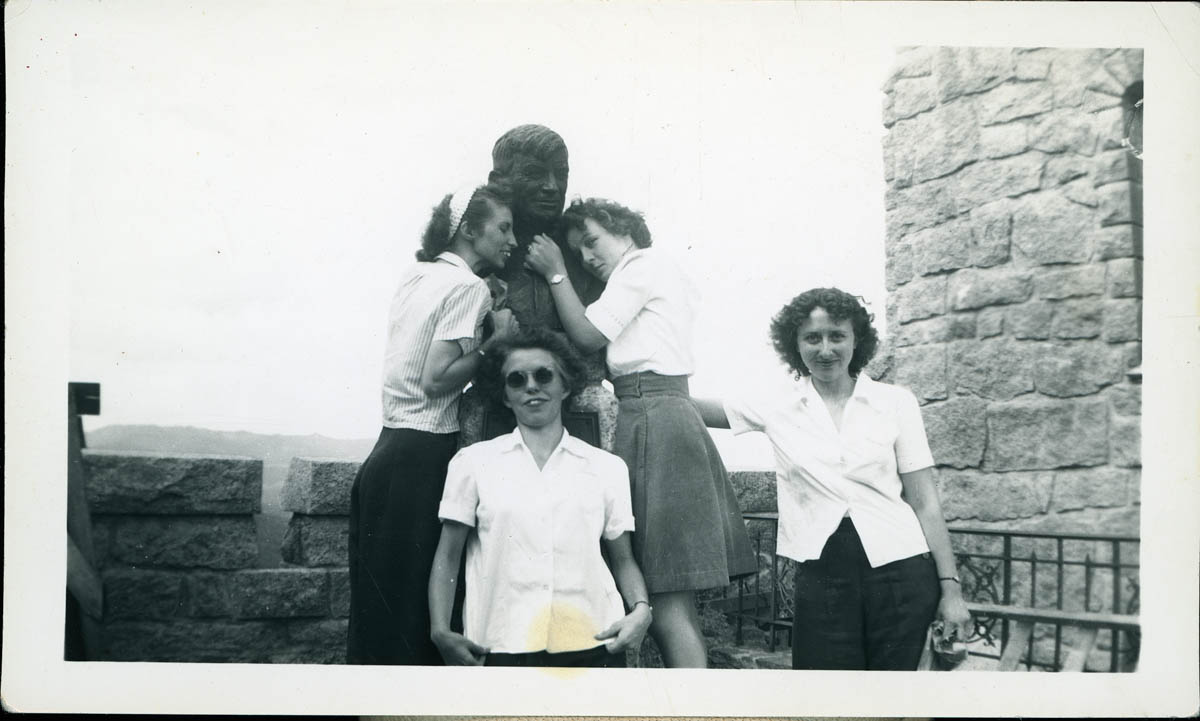 Photograph of Faye and Flossie Wilson with Friends at Will Rogers Bust at the Shrine of the Sun