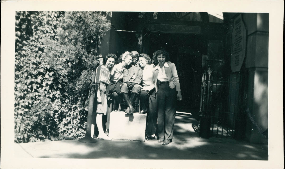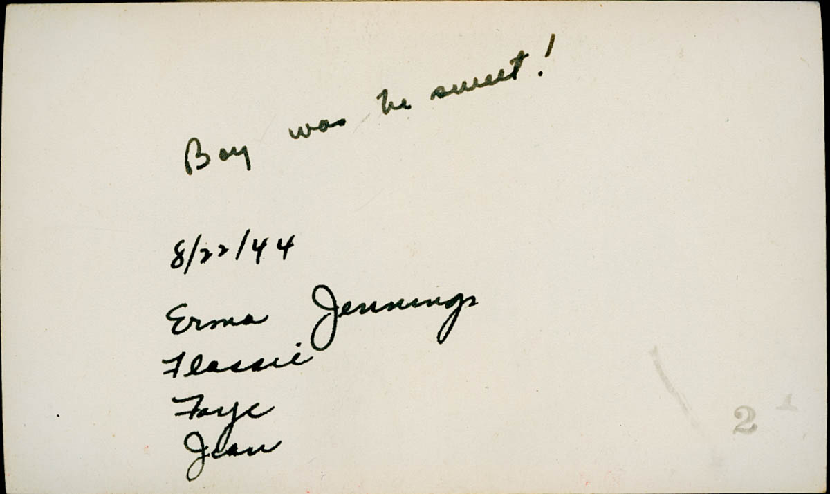 - Photograph of four young women with a sculpture. Handwritten label on back says "Boy was he sweet! 8/22/44 Erma Jennings, Flossie, Faye, Jean"