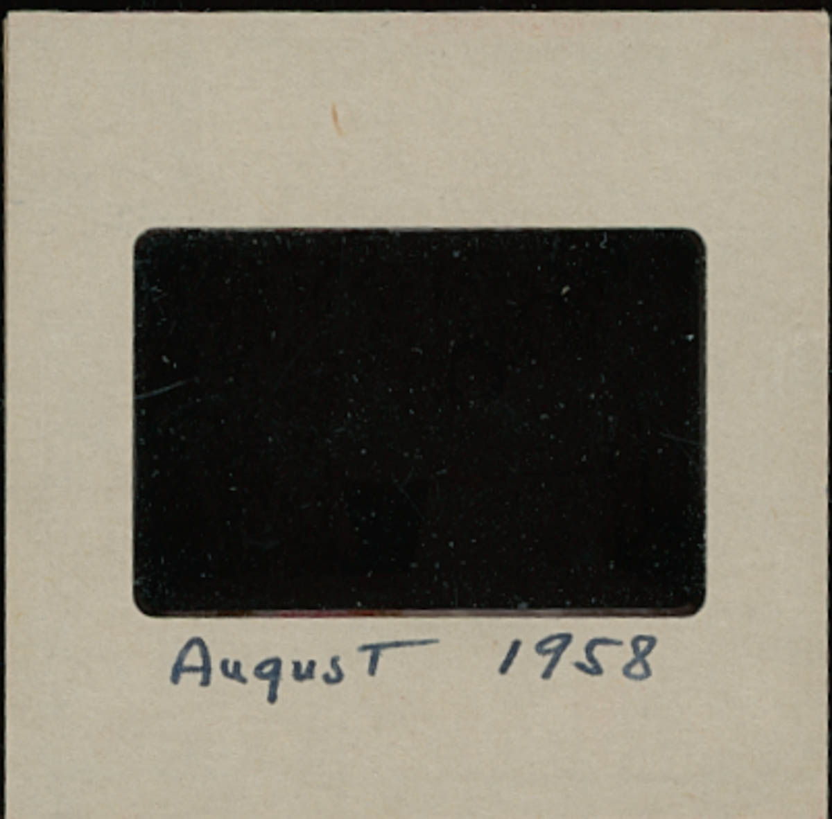 - Snapshot of a woman and two men standing behind a table with food and a cake with lit candles. Handwritten label on slide frame says "August 1958"