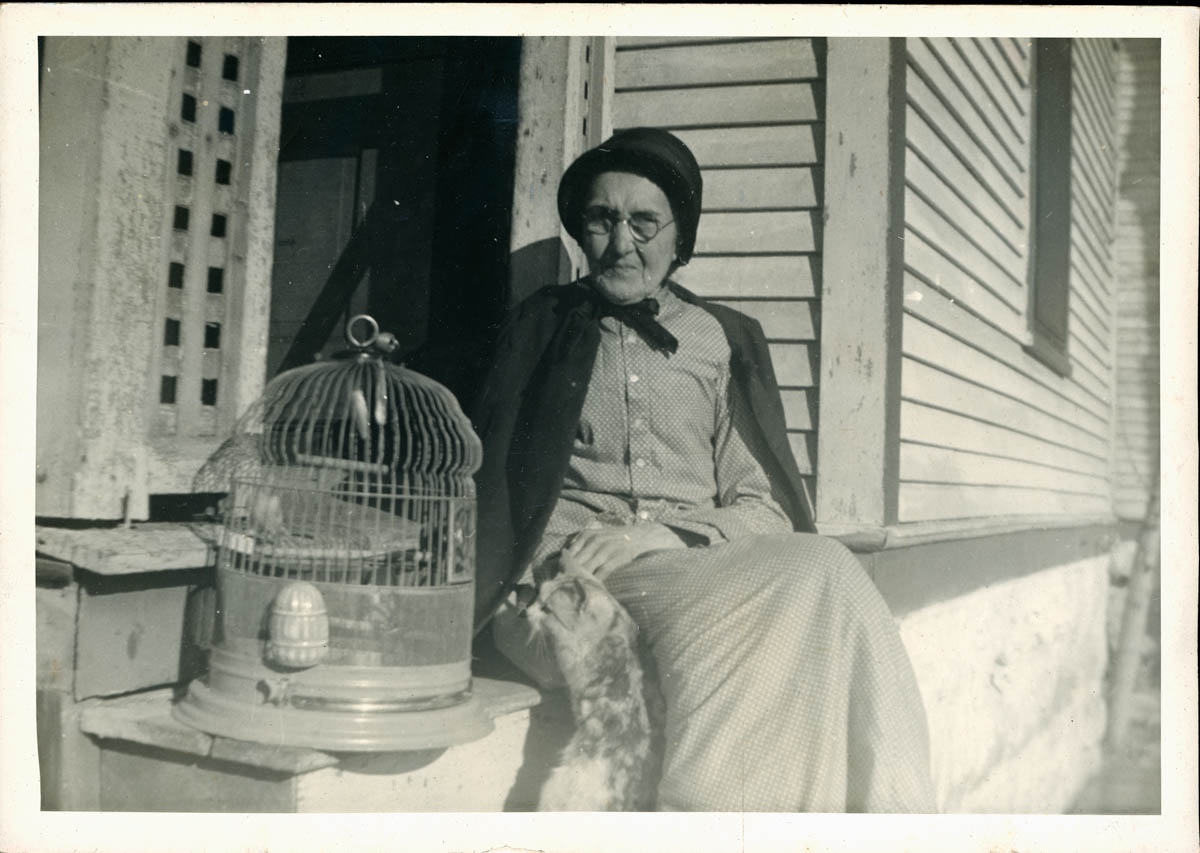 - Snapshot of an elderly woman sitting on a porch with a bird in a cage. Handwritten label on back says "Nannie Shockey"