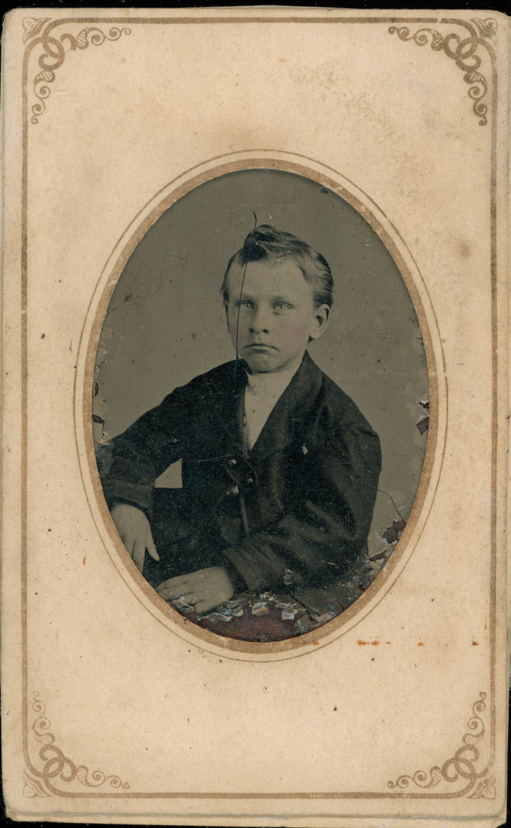 - Portrait of a boy. Handwritten label on back says "William Thomas Montgomery Born Sept 20 - 1863 - father of Roy, Clifford, Beulah, Carey Montgomery. Died Dec 22, 1906."