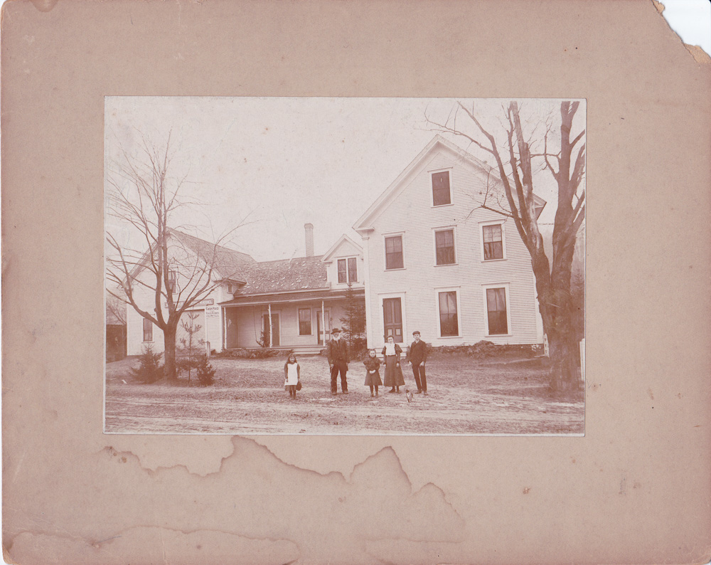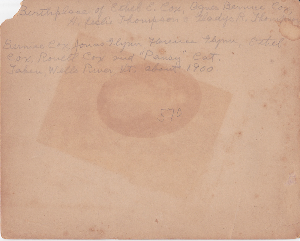 Handwritten label on back says "Birthplace of Ethel E. Cox, Agnes Bernice Cox, H. Leslie Thompson, Gladys R. Thompson. Bernice Cox, Jonas Glynn, Florence Glynn, Ethel Cox, Ronell Cox and 'Pansy' Cox. Taken Wells River VT, about 1900" - Date