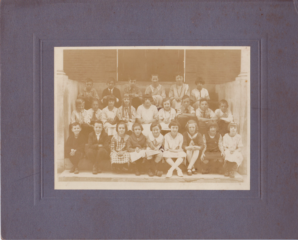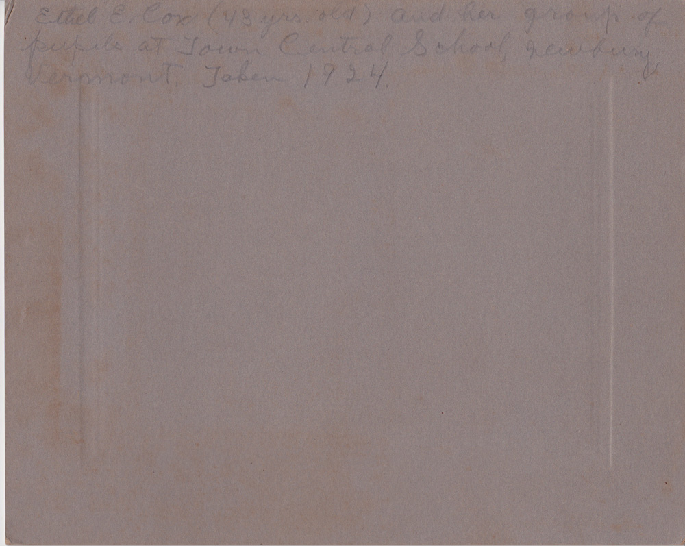 Handwritten label on back says "Ethel E. Cox (43 years old) and her group of pupils at Town Central School, Newbury, Vermont. Taken 1924." - Date